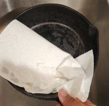 Water can cause rust in minutes if left on the surface. Thoroughly dry the pan with a paper towel or lint-free cloth. You can also set it on a burner on low heat for 1–2 minutes to evaporate any leftover moisture.