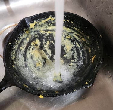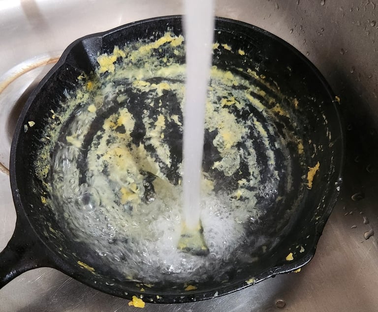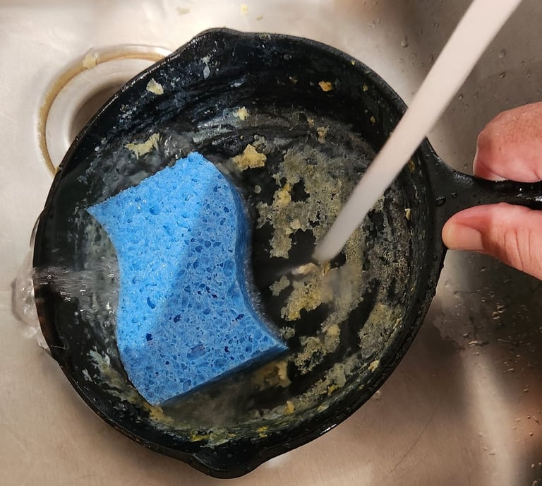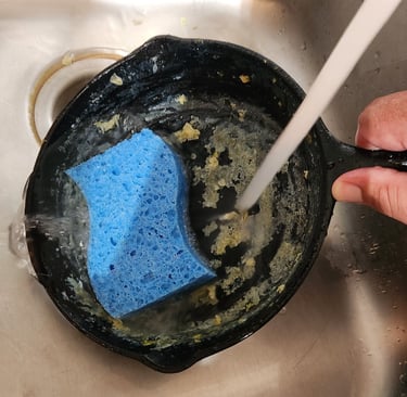 Run the pan under warm water. Use a brush, sponge, or chainmail scrubber to gently remove any food residue. Avoid dish soap and never soak your cast iron — water is cast iron’s enemy if it sits too long.