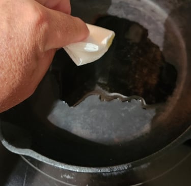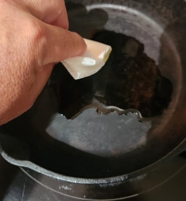 Once dry, apply a thin layer of oil to the entire surface — inside and out — using a paper towel. Be sure to rub it in thoroughly so it’s not greasy. We prefer natural beef tallow, which can be found here: https://amzn.to/4fmHJZ7